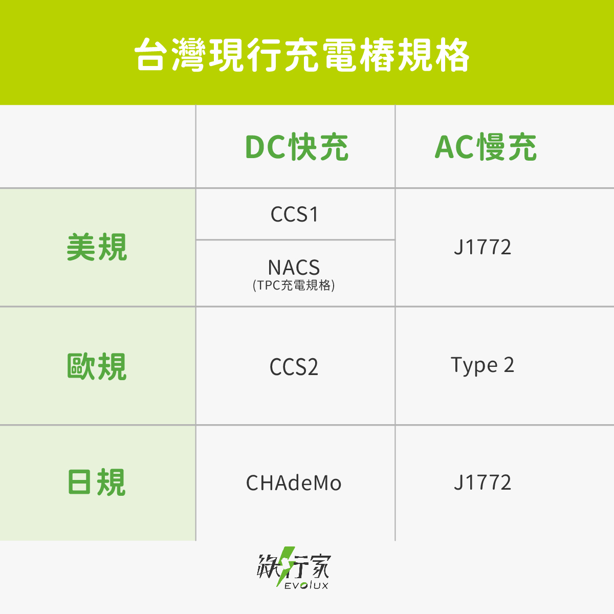 快充充電接則可分為三種規格CCS1、CCS2、CHAdeMO: