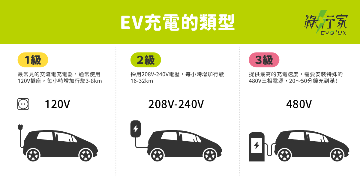 Level 3: 可提供最高 400A的充電速度,並提供 50 至 350 千瓦的快速充電功率。大多數電動車可在 0~100%充到滿也僅需20~50分鐘左右。 它需要安裝特殊的 480 伏特三相電源。若頻繁使用高功率會縮短電池