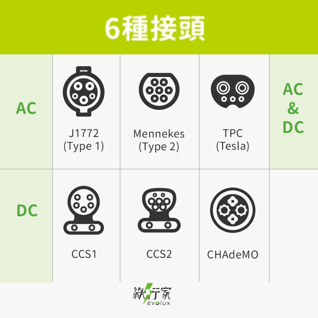 慢充充電接頭則可分為三種規格: Type 1 、Type 2 與 TPC.